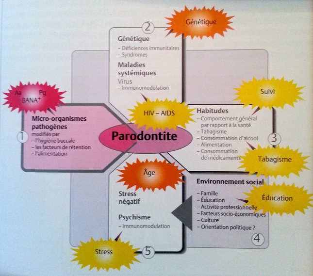 Etiologie multifactorielle : microbienne , inflammatoire , génétique , l’état de santé générale ( diabète , VIH , Papillon-Lefèvre ...), les médicaments , stress , tabac , l’alcoolisme, hygiène dentaire personnelle , accès aux soins